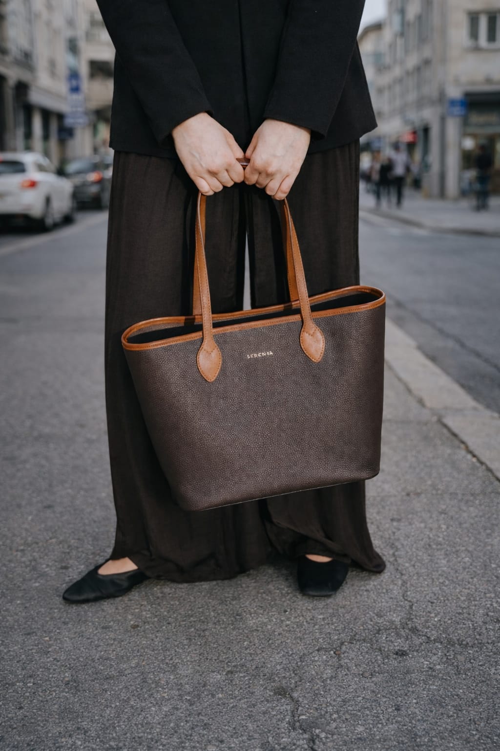 Geanta prezentată este un model tip shopper, in nuanta de maro închis, completat de mânere și finisaje contrastante în tonuri calde de caramel ,elegant și versatil, realizat într-un design minimalist care nu se demodează niciodată. Confecționată din piele NATURALA, aceasta impresionează prin aspectul său rafinat, fiind alegerea ideală pentru femeile care apreciază stilul simplu, dar sofisticat.